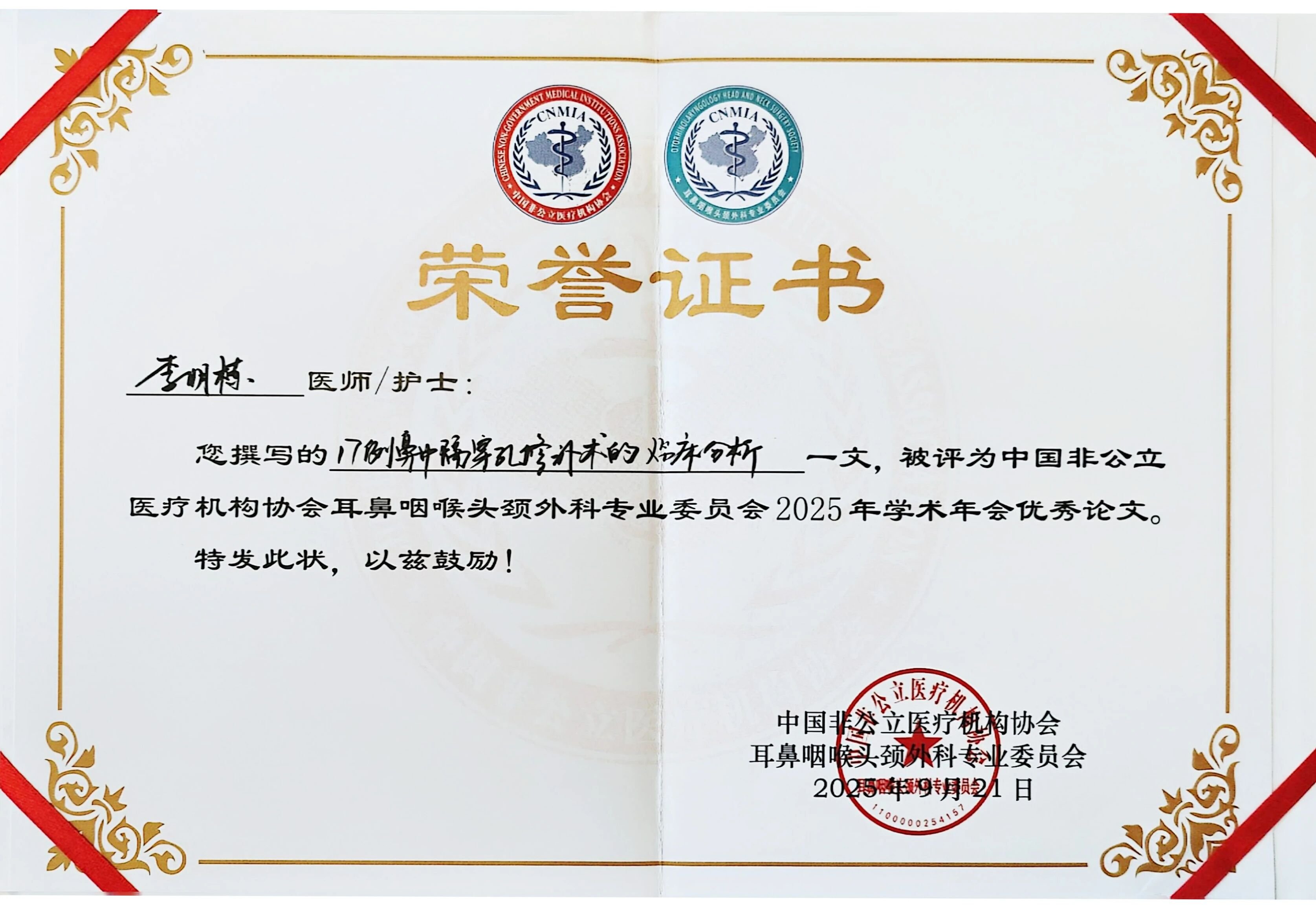 会上,我院鼻科主任李明栋凭借《17例鼻中隔穿孔修补术的临床分析》荣获优秀论文奖。该研究通过详实的病例数据与技术创新分析,为鼻中隔穿孔修补提供了新思路,获与会专家高度评价。
