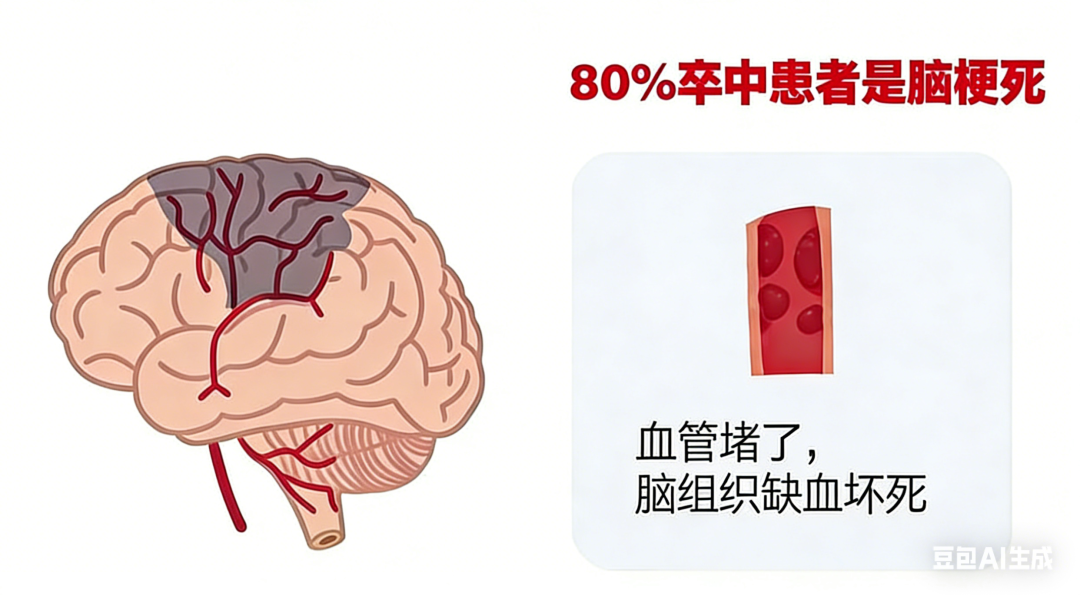 卒中里最常见的类型,各种脑血管病变导致脑部血管“堵了”,引起脑组织缺血、缺氧性坏死,要溶栓、疏通。