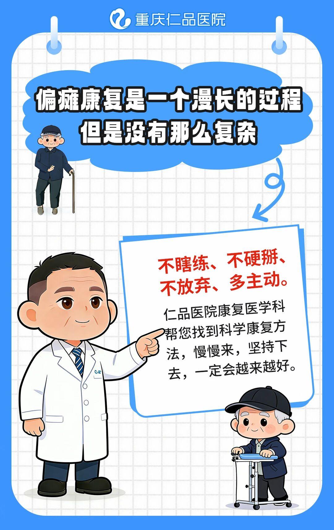 偏瘫康复是一个漫长的过程,但是没那么复杂:不瞎练、不硬掰、不放弃、多主动。仁品医院康复医学科愿帮您,找到科学康复方法,慢慢来,坚持下去,一定会越来越好。